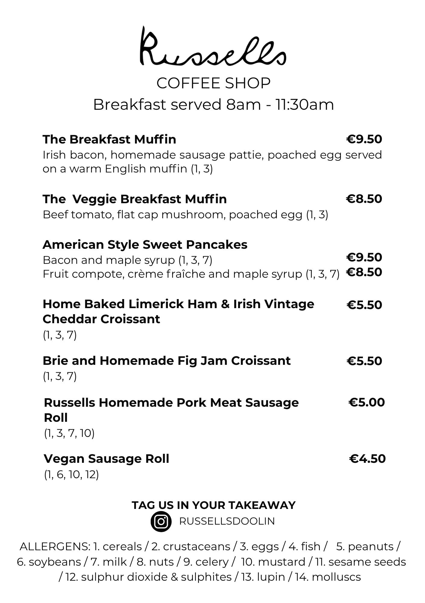 Welcome to Russells Coffee Shop, part of Fiddle + Bow Collection Doolin. We serve a variety of hot and cold drinks, sausage rolls, scones and sweet treats. Everything you need to set you up for the day before you explore the beautiful West Coast.